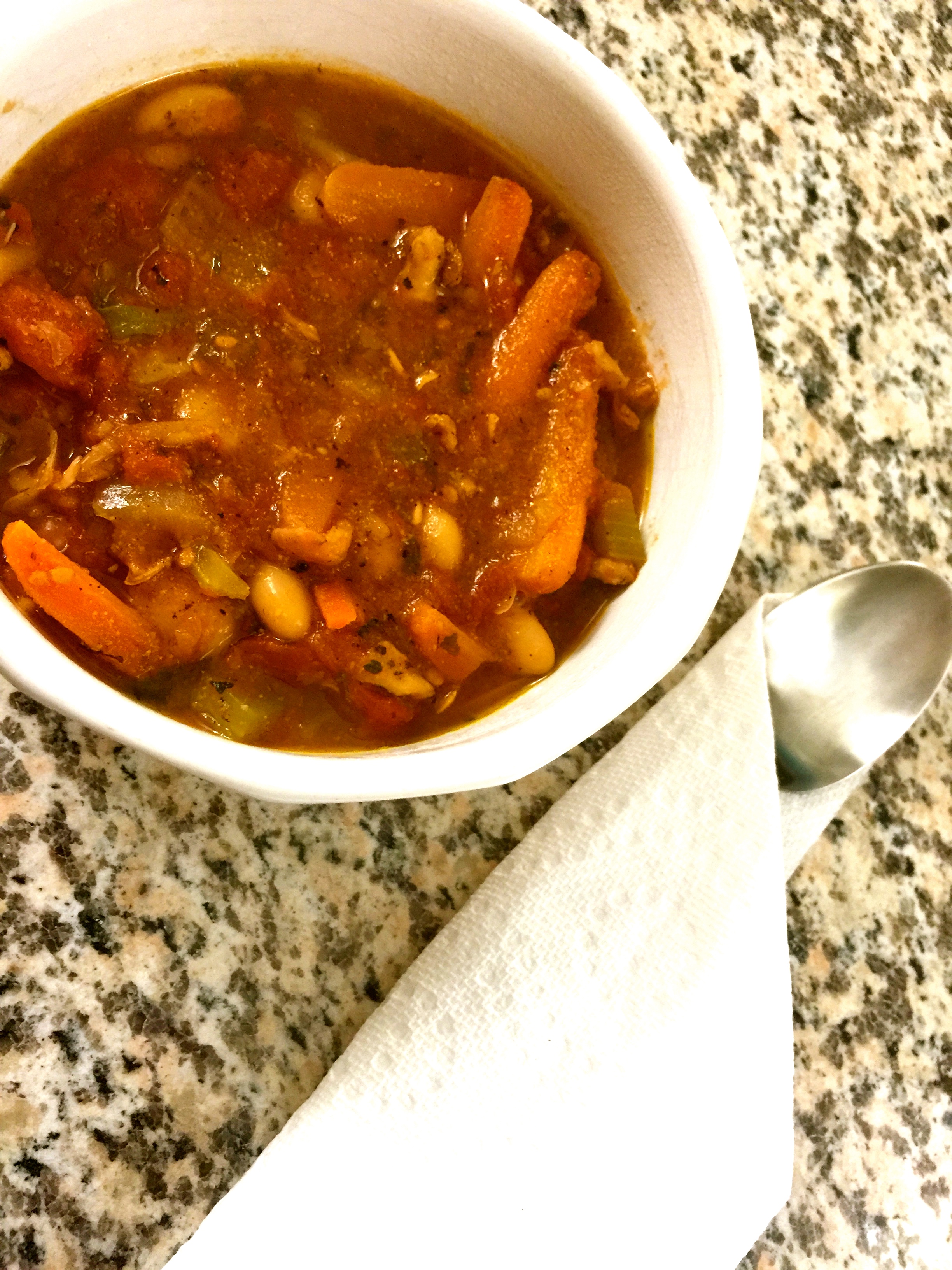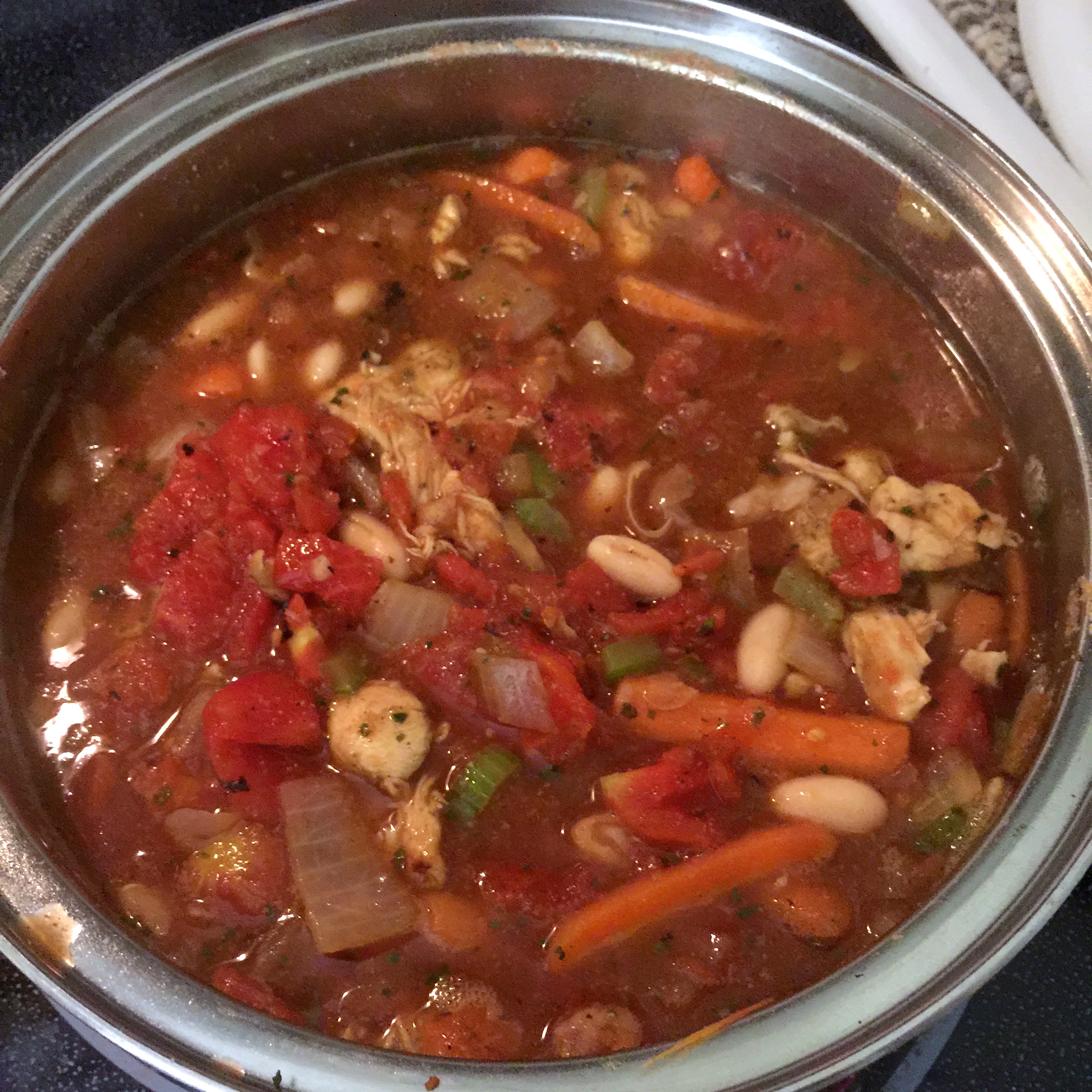 I started this modified recipe by dicing chicken and then seasoning it with garlic, pepper and thyme in a sauce pan. While that cooked, I chopped up the celery, onion and carrots. I removed the chicken and then put the veggies in the pan to cook until translucent. Once cooked, I added the chicken back in, put in the broth, put in the tomatoes and added more seasoning, I also then added the beans.