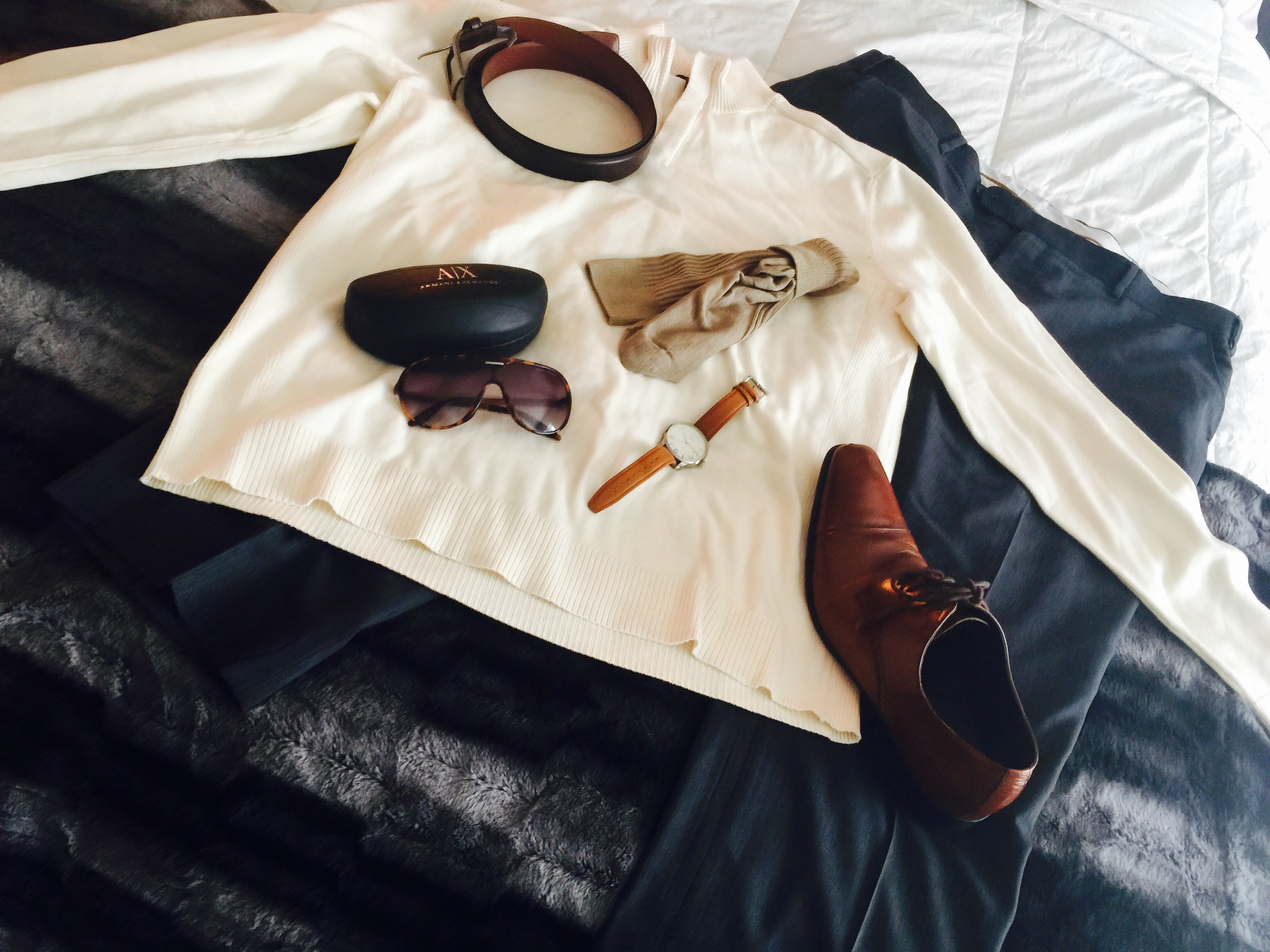 Look: Cream Quarter Zip, Gray Dress Pants, Brown Shoe, Khaki Socks, Shield Sunglasses, Bright Brown Leather Watch, Chocolate Leather Belt.
