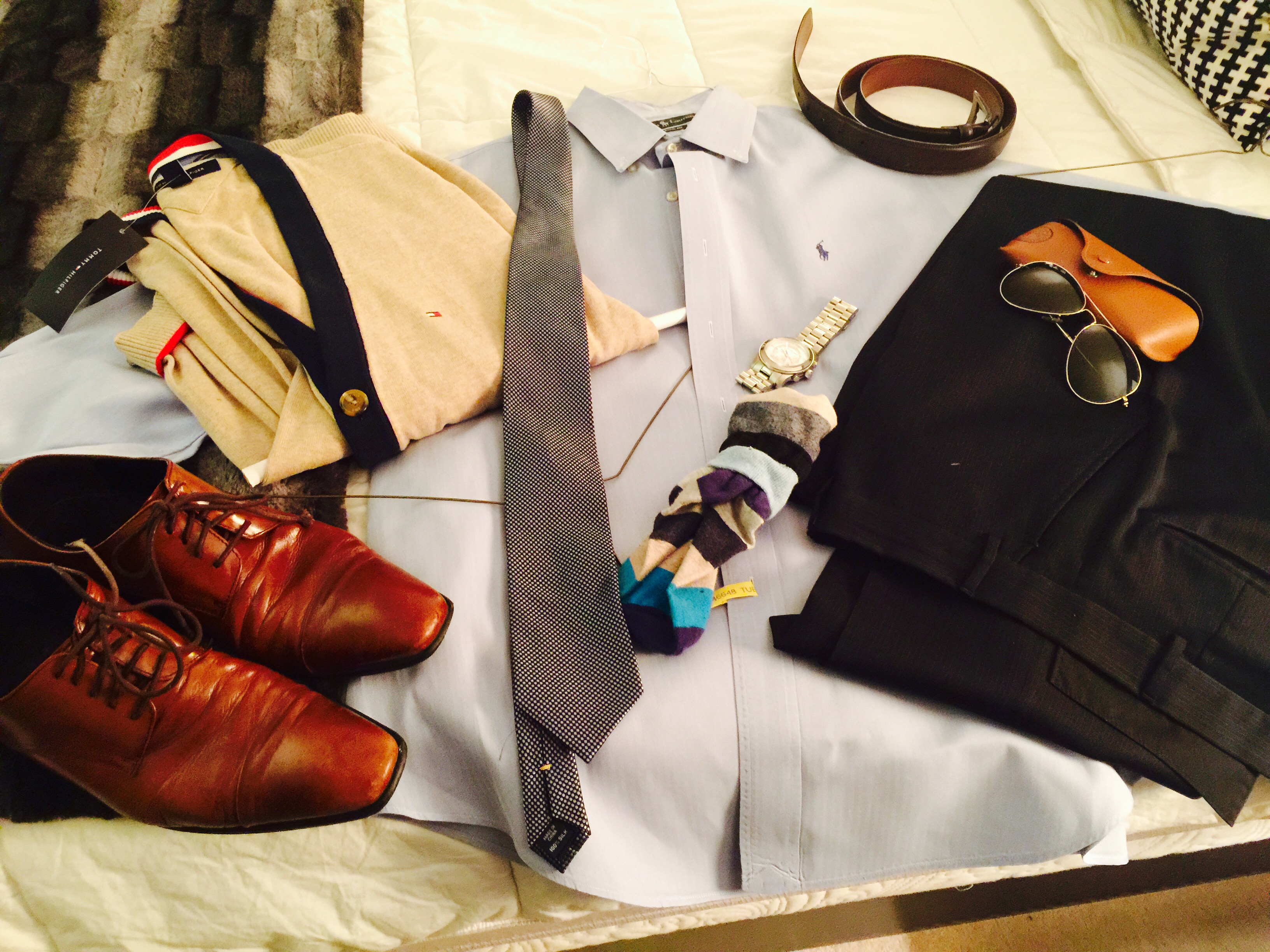 Look: Blue Dress Shirt, Navy Pant with Brown Pin Stripe, Navy Dotted Tie with Muted Gray, Khaki Sweater with Navy Accents, Blue/Khaki Color Blocked Socks, Brown Shoe, Classic Gold Aviator, Chocolate Belt.