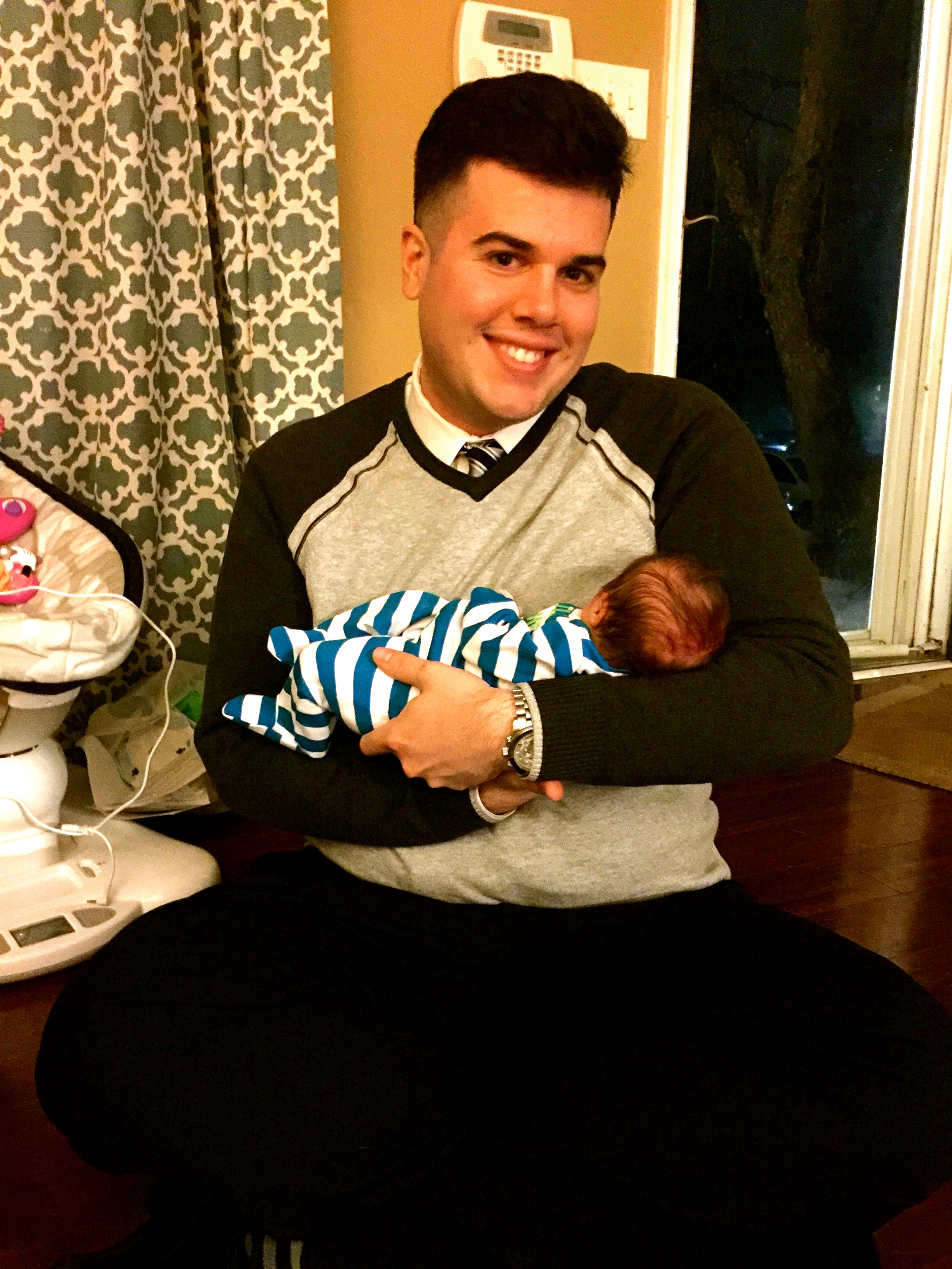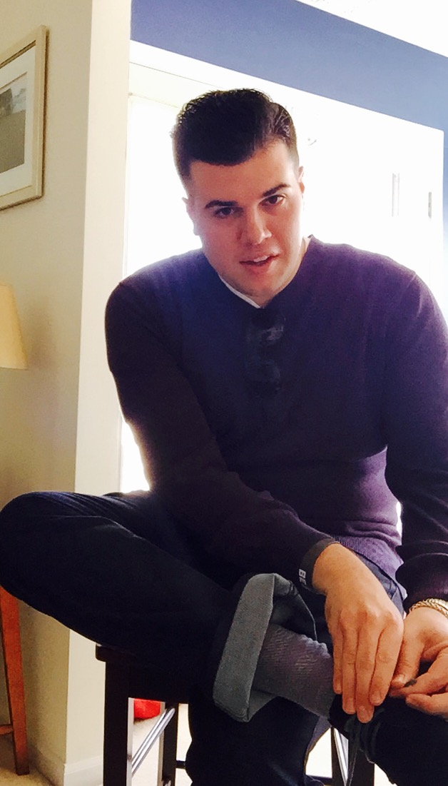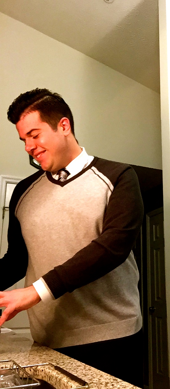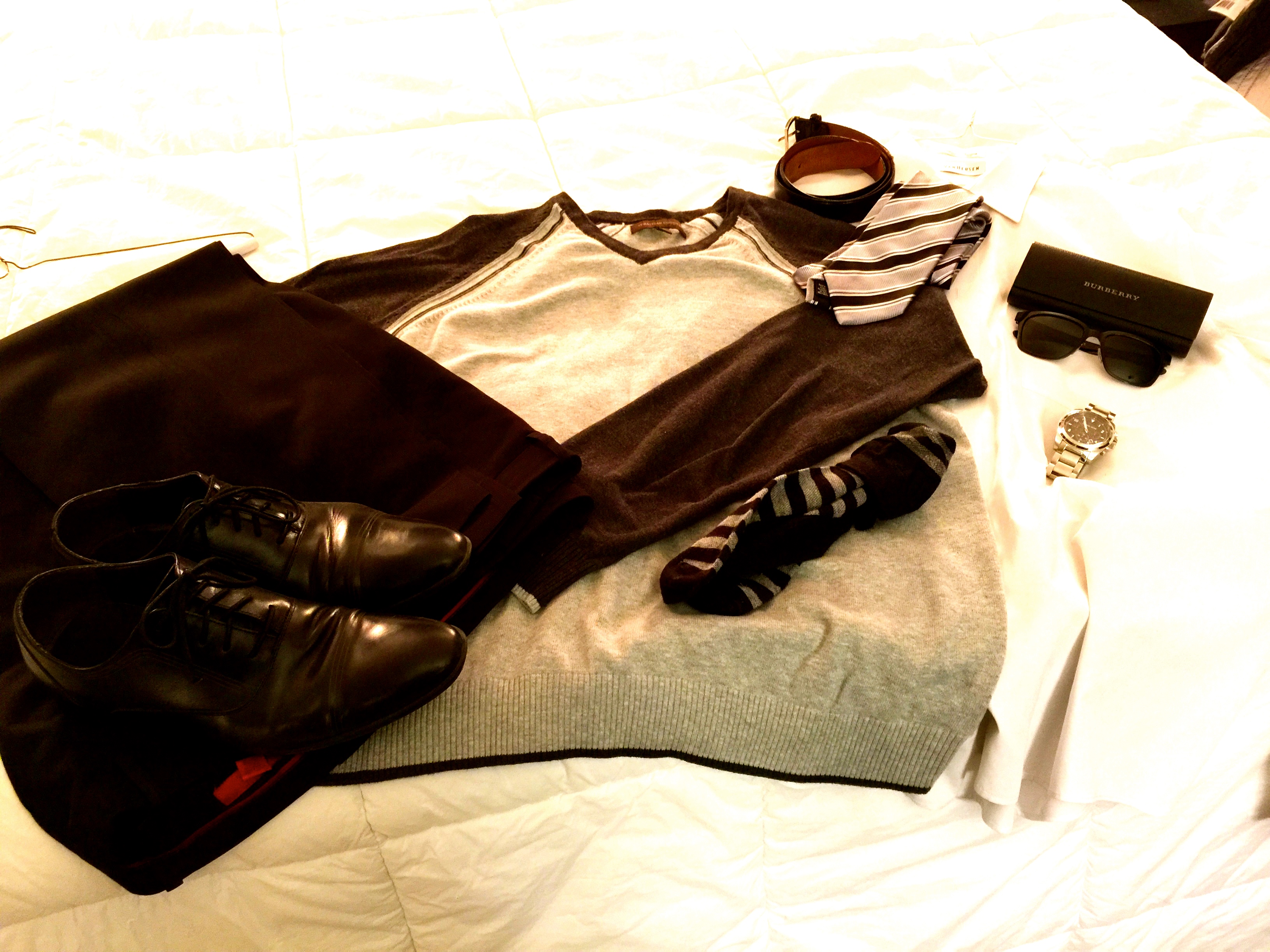 Look: White Shirt, Charcoal and Heather Gray Sweater with detailed cable piping at sleeve=line, black pin-stripe pants, striped socks, stripe silk tie, metal new aviator sunglasses, silver watch with dark gray/red accents, black leather belt.