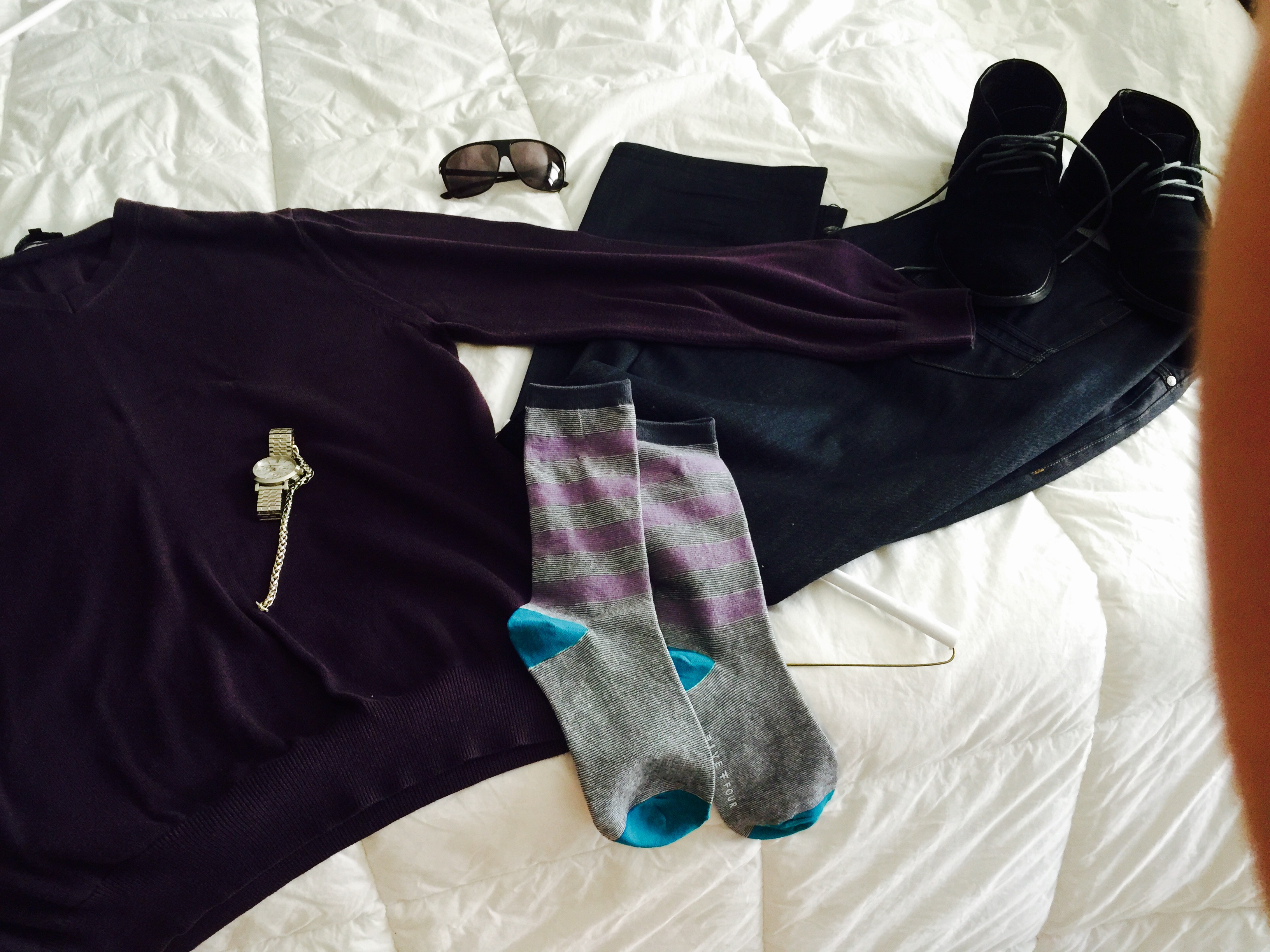 Look: Dark Purple V Neck Sweater, Dark Blue Denim Jeans, Purple Striped Socks, Vintage Watch, Rope-Chain Bracelet, Black Suede Ankle Boots, Oversized Black Shield Sunglasses