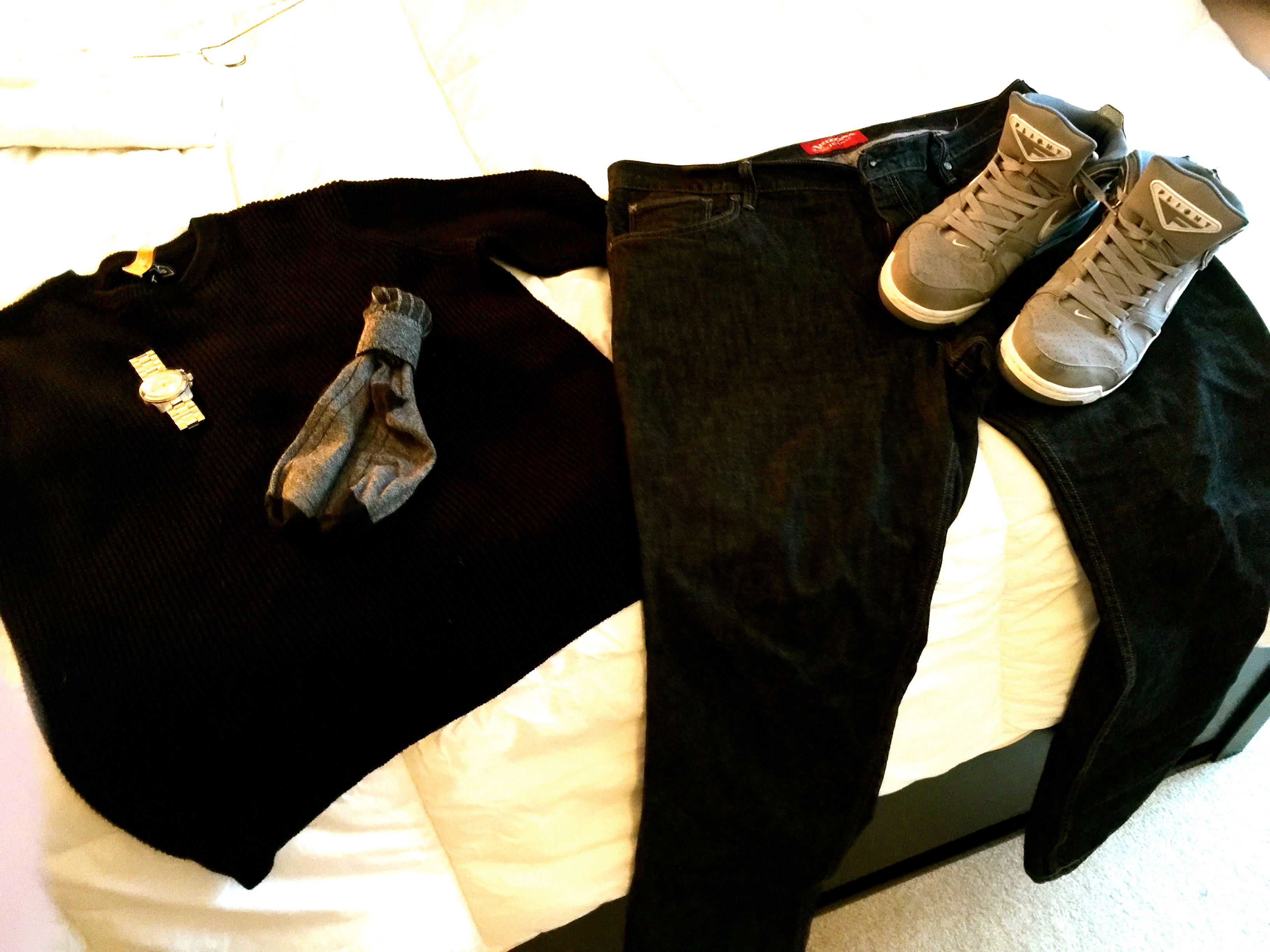 Look: Black Waffle-Knit Sweater, Gray and Black Socks, Silver Watch, large, gray high tops, gray denim jeans