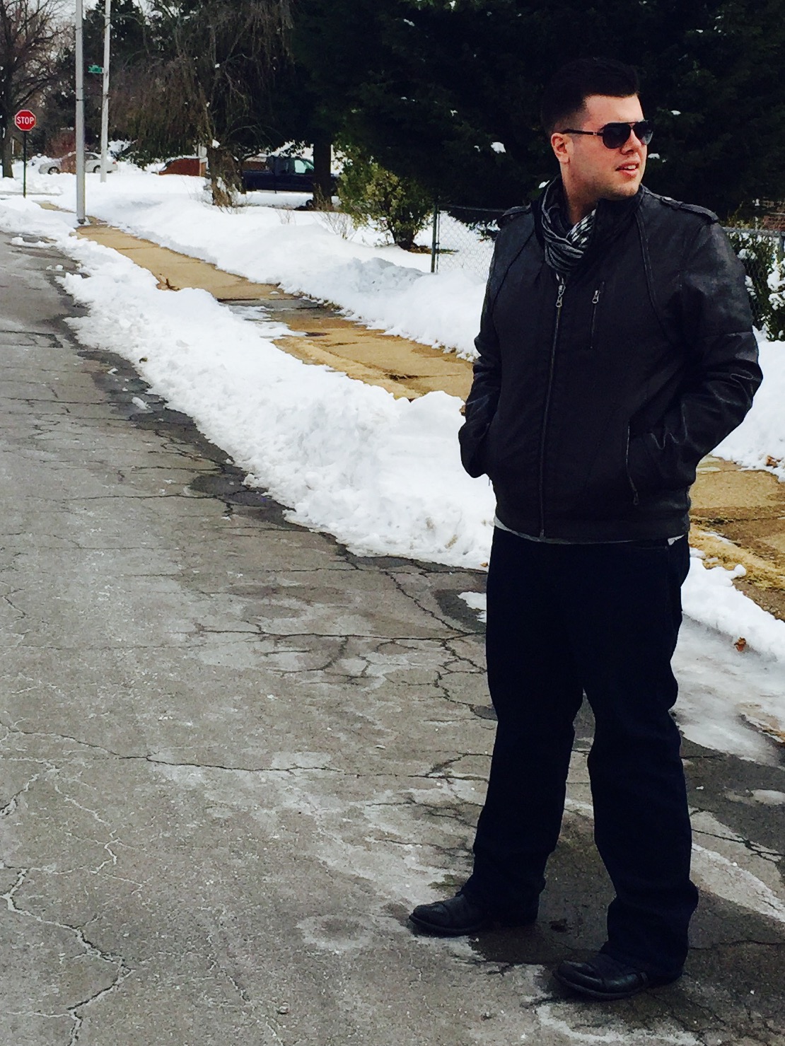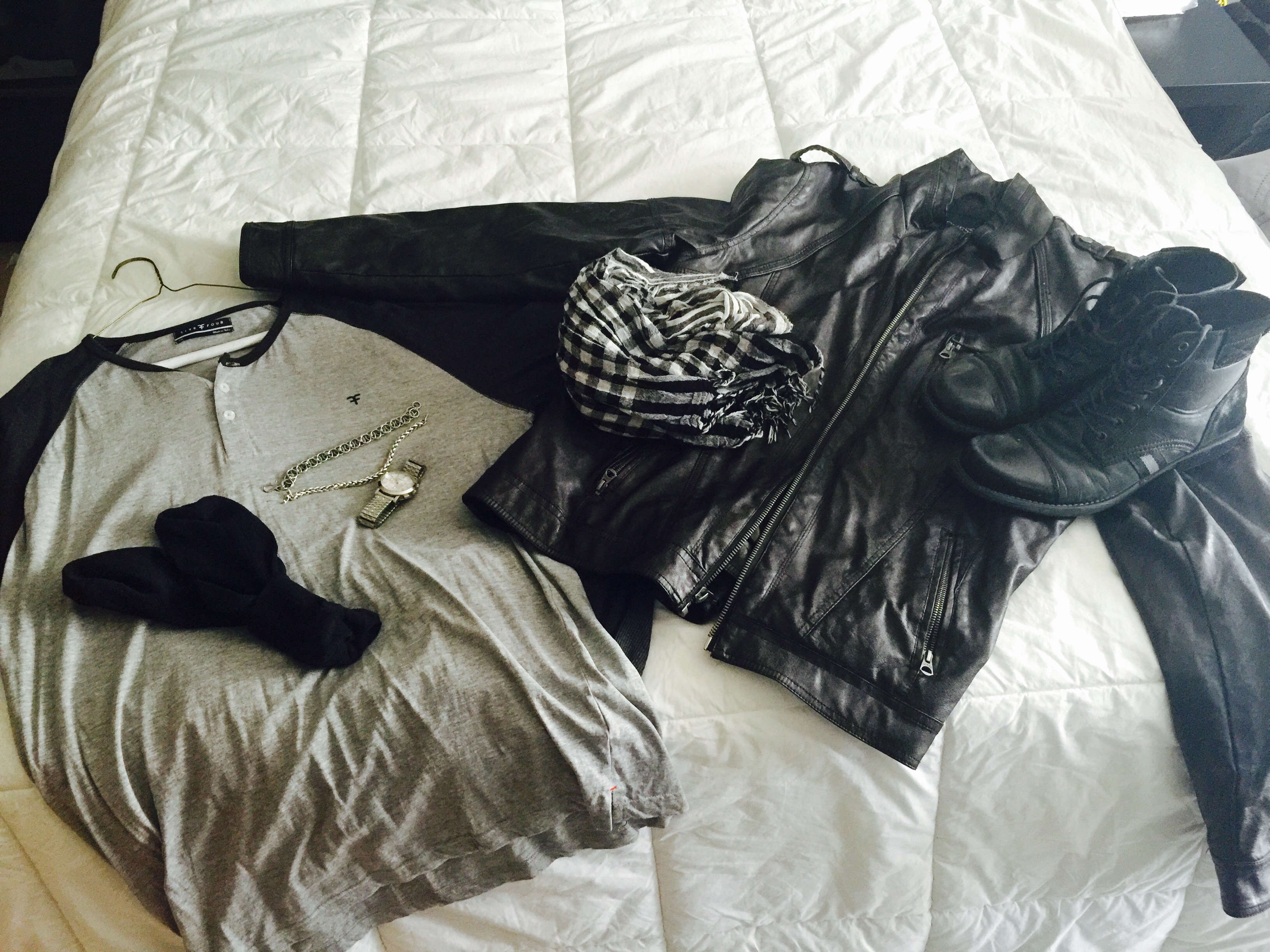 The Look: Two-Tone Gray 3/4 Sleeve Tee, Charcoal Gray thermal, Leather Jacket, Blue Denim, Black Grunge Boots, Distressed black and white scarf.