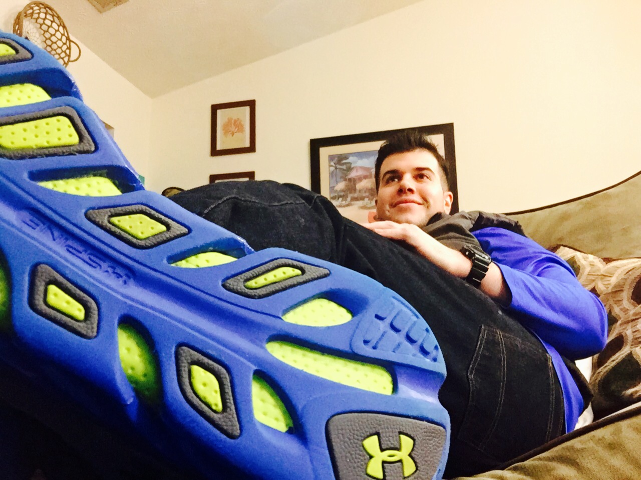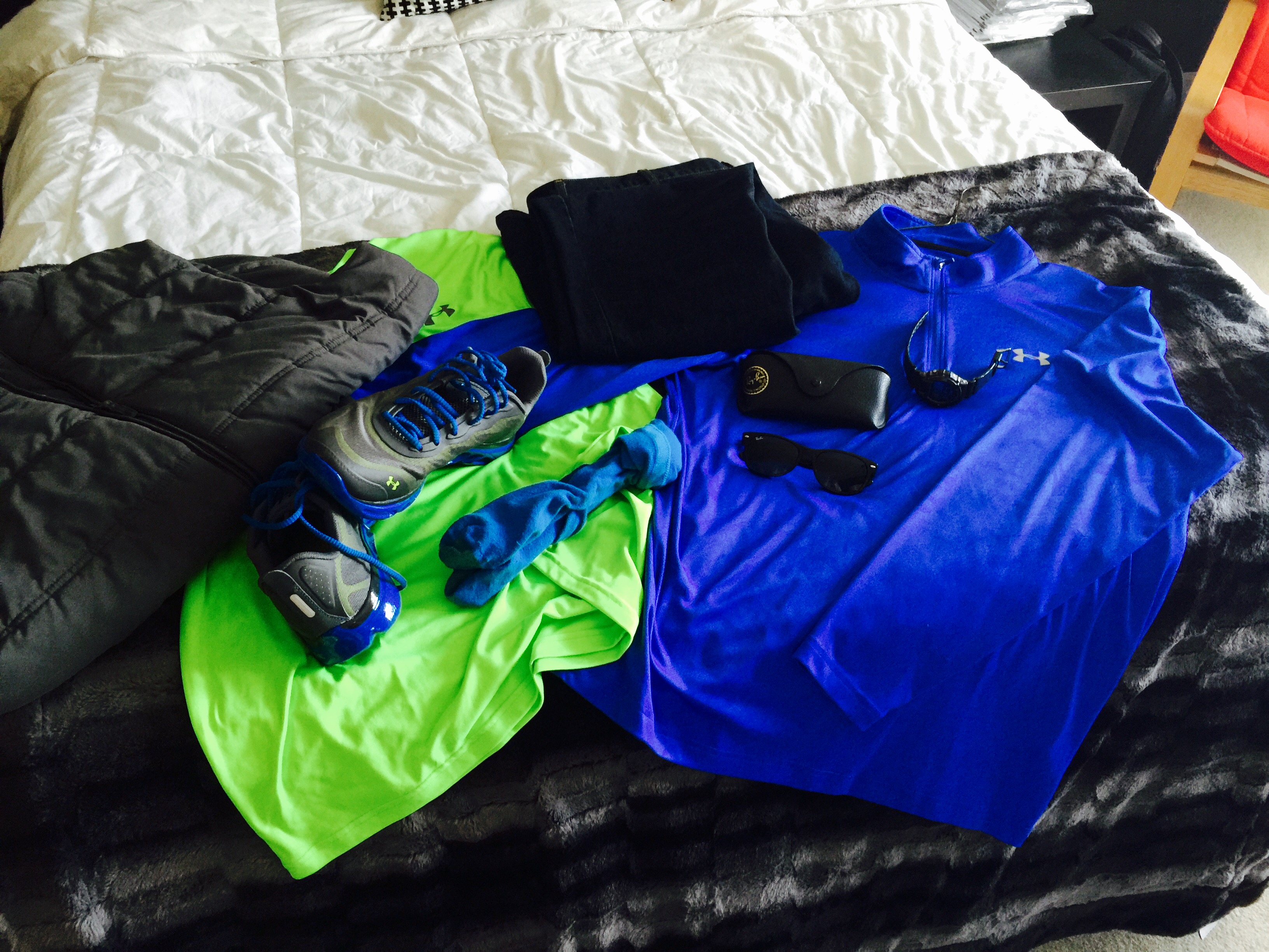The Look: Neon Green Workout Tee, Bright Blue Quarter Zip, Dark Denim, Matching Blue Socks, Matching Blue and Green Workout Shoes, Gray Puffer Vest, Sport Watch, Black New Aviators.