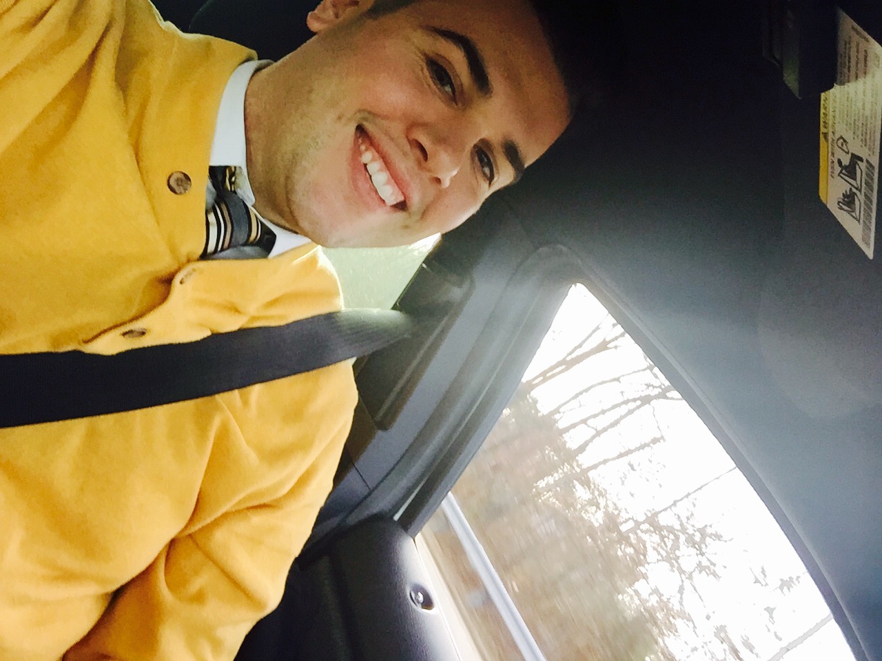 The Look: White Shirt, Gray Pants, Brown Shoes, Silver Watch, Tortoise Shield Sunglasses, Gray Socks, Silver Watch, Mustard Mockneck Sweater, Mustard, White, Brown and Gray Tie.