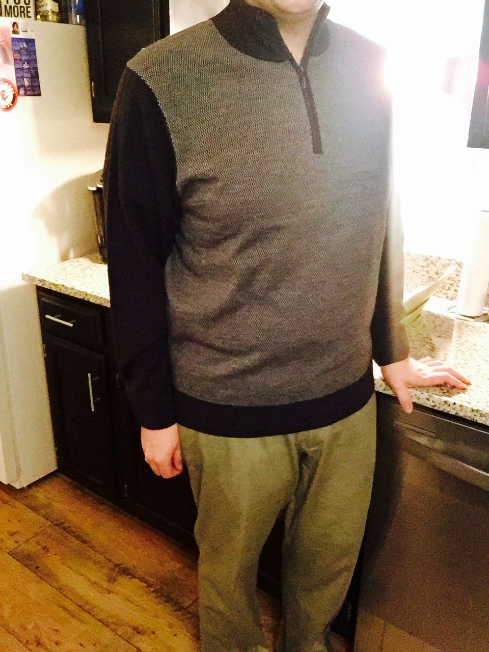 The Look: Textured two-tone gray quarter zip, basic khakis (tailored), Striped Socks, Black Suede Shoes