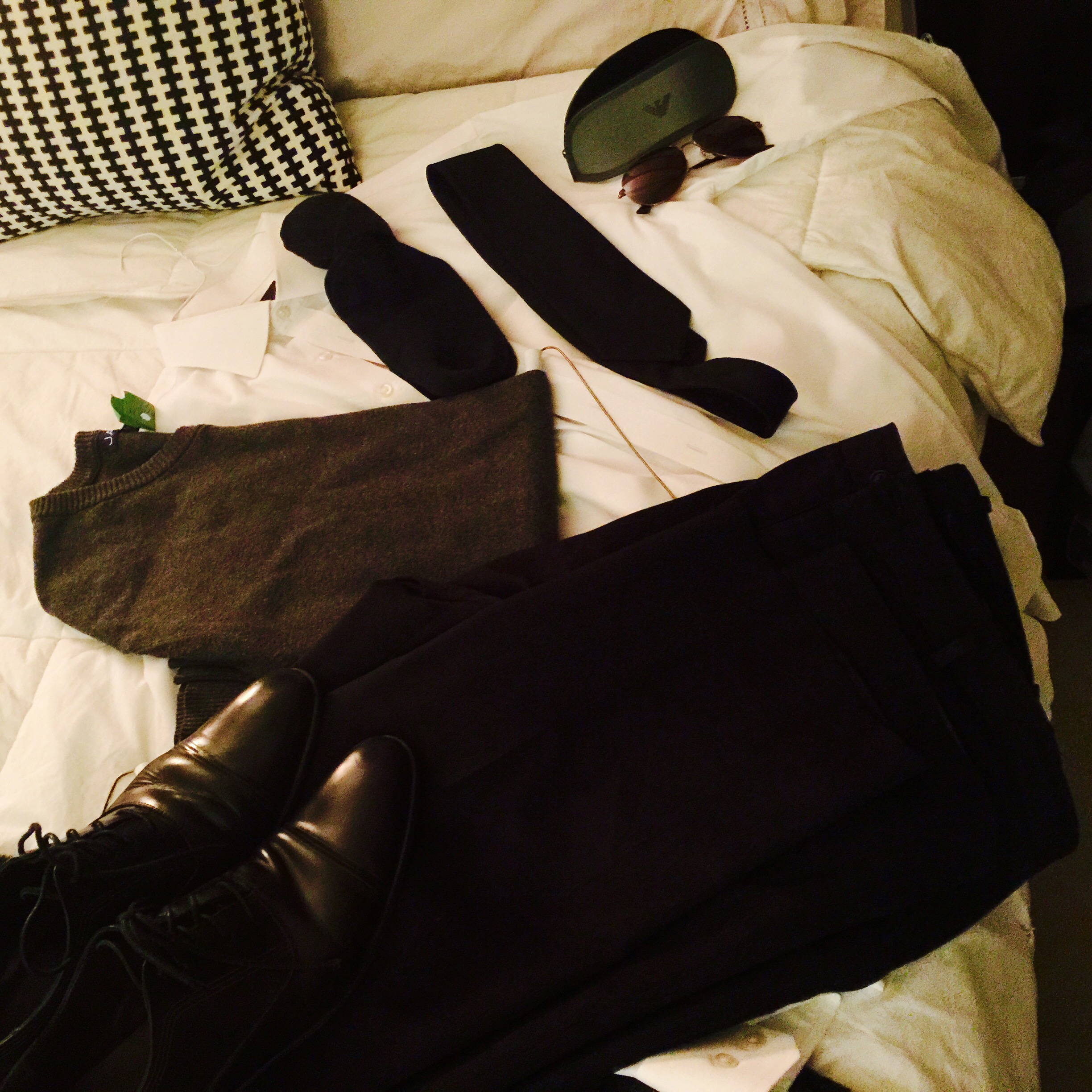 The Look: Charcoal V Neck Sweater, Black Pinstripe Pants, Black Socks, Black Shoes, White Shirt, Black Aviators, Black Textured Tie.