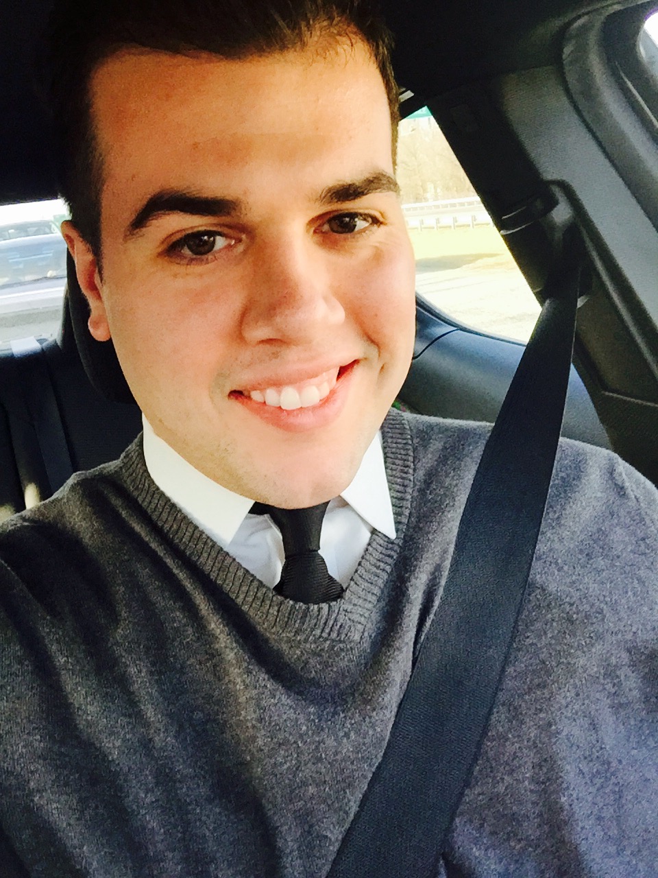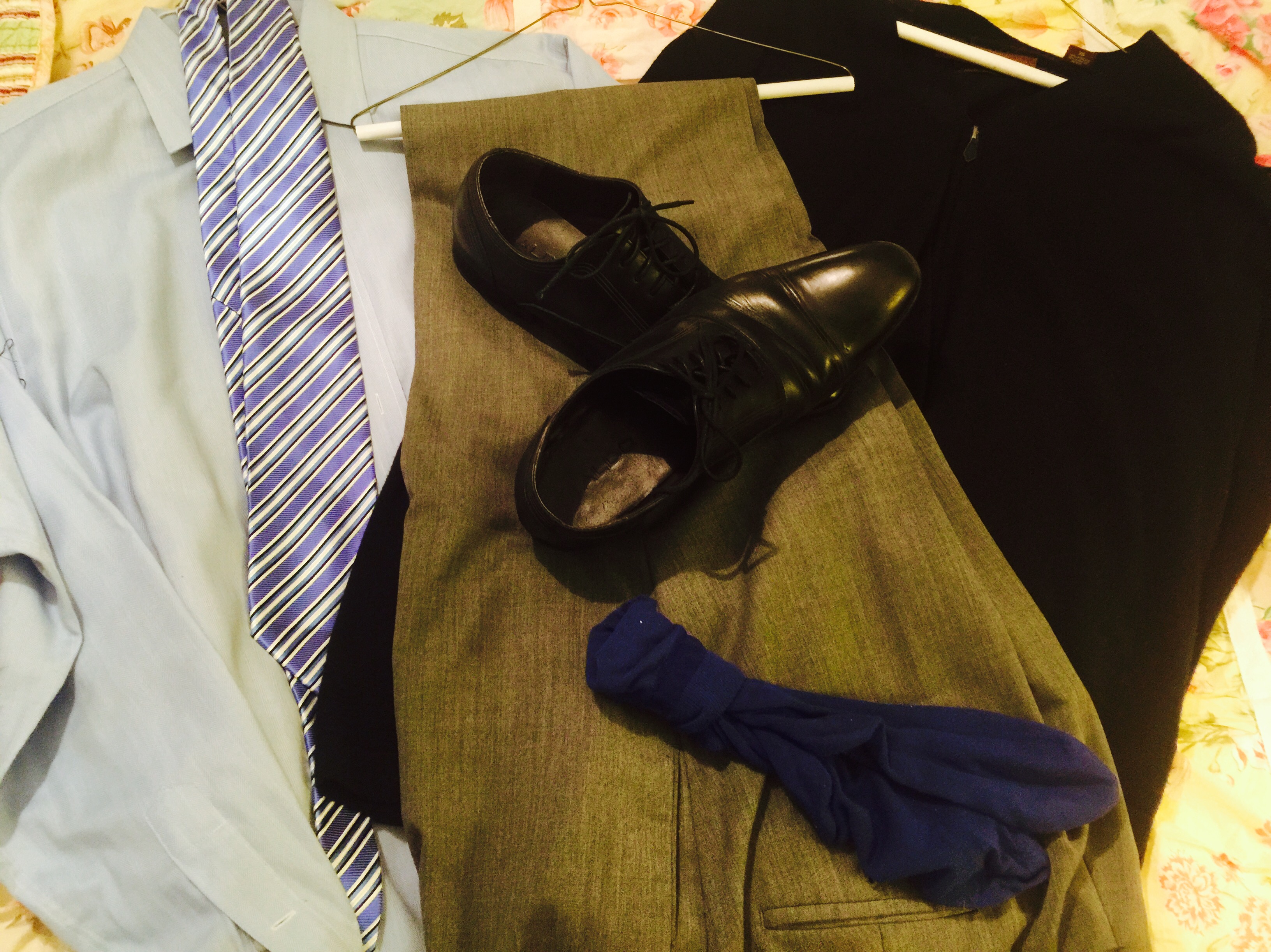 The Look: Heather Gray Pants, Light Blue Shirt, Royal Blue Socks (Pop of Color), Black Zip Up Cardigan, Black Shoes, white and blue tie with black accent.