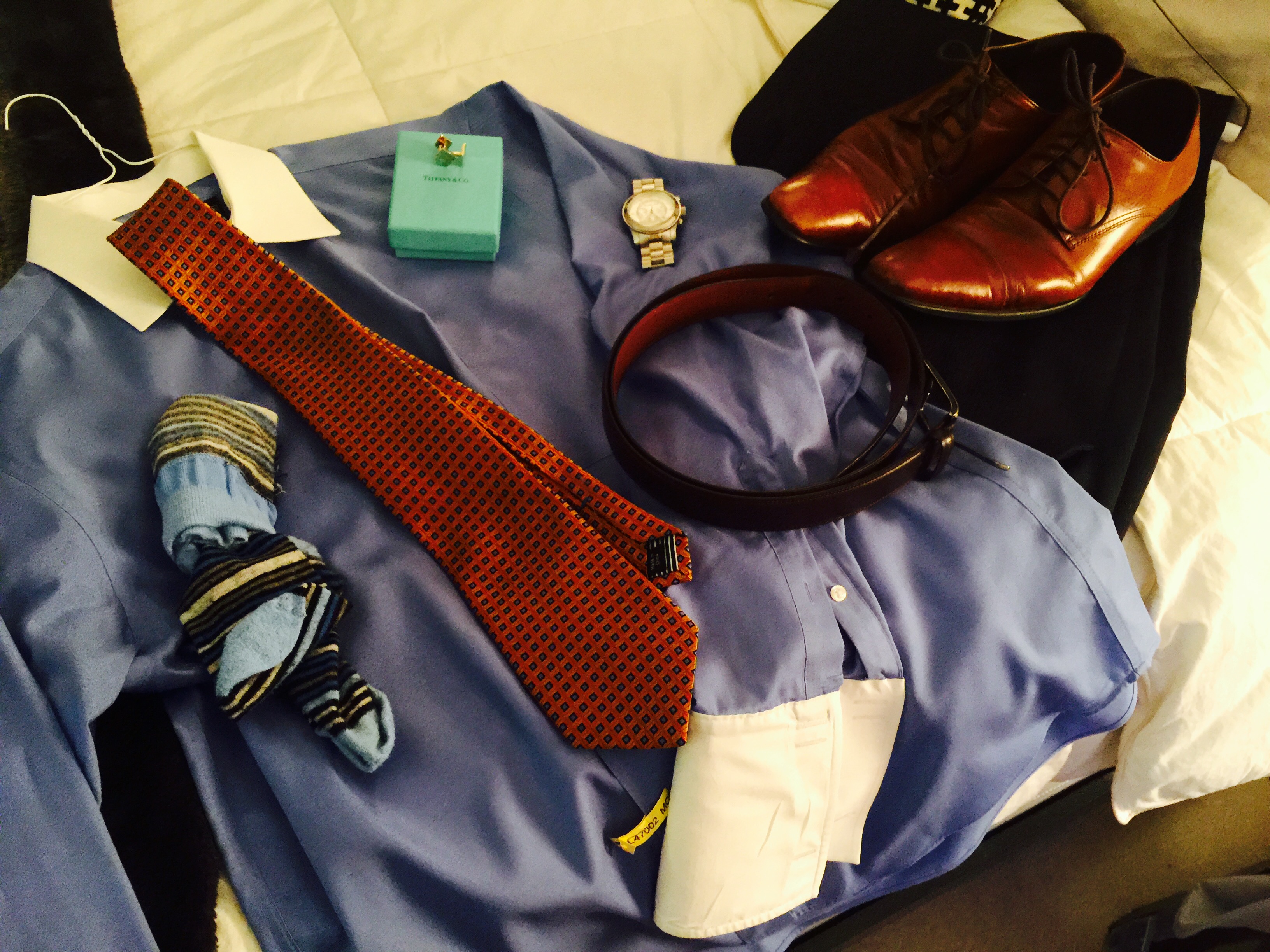The Look: Blue Shirt with White French Cuffs, Silver Cufflinks, Navy Pinstripe Pants, Blue and Gray Striped Socks, Silver Watch, Brown Shoes, Orange and Blue Squared Watch, Brown Belt