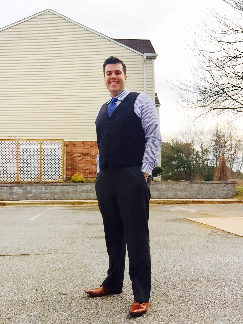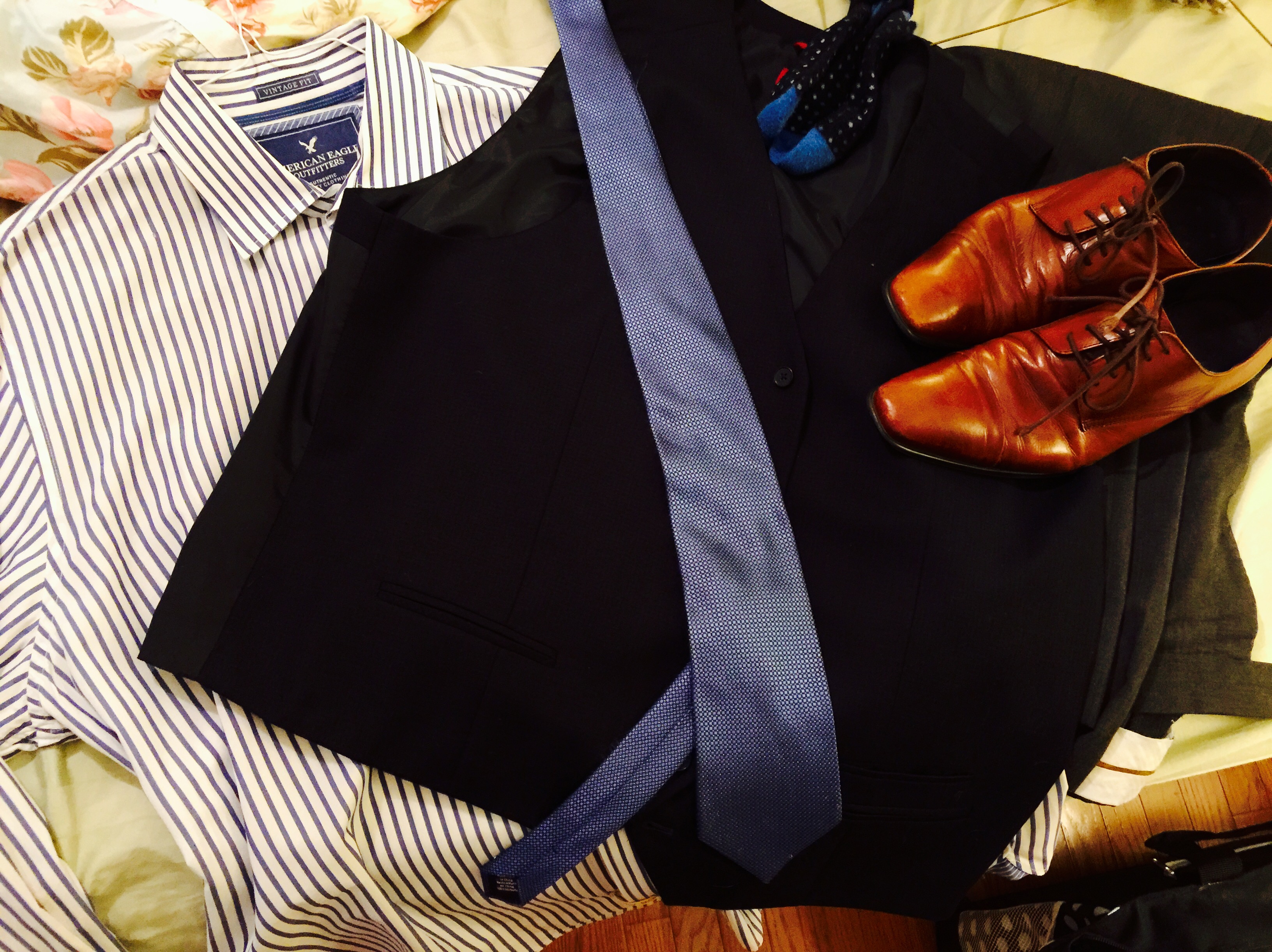 The Look: Royal Blue Striped Dress Shirt, Blue Tie with Micro Dots, Navy Blue Vest, Charcoal Grey Pants, Blue Polka Dots Socks, Brown Shoes