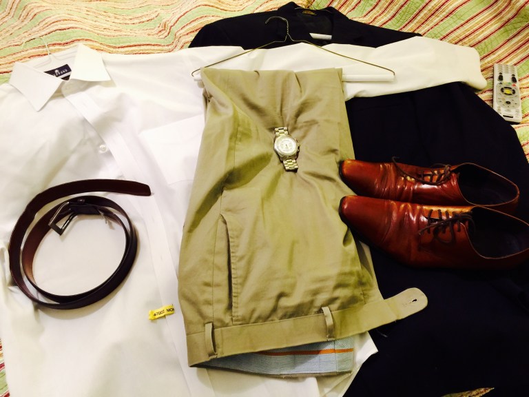 The Look: Khakis, White Shirt, Navy Blazer, Brown Belt, Blue Striped Socks, Silver Watch
