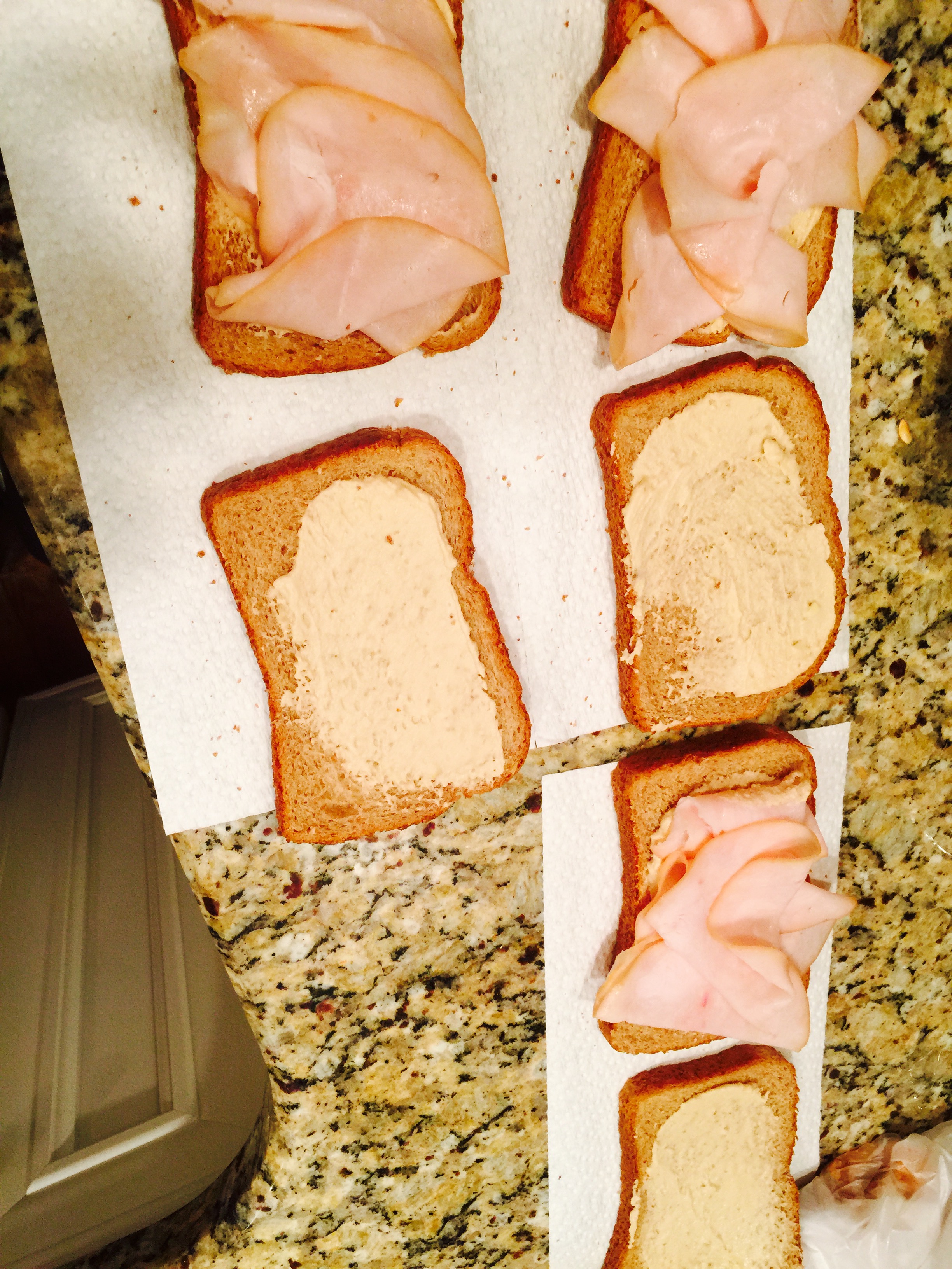 Next, put 3 slices of turkey on 3 slices of the bread: